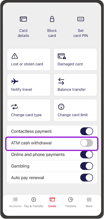 - Choose the card you want and turn the ATM Cash Withdrawal switch on or off.