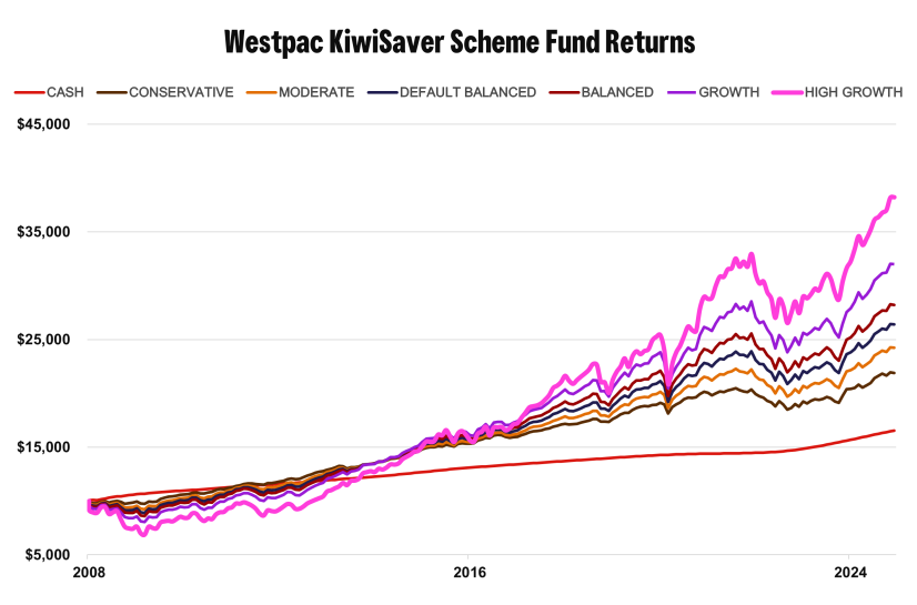 2 The Moderate Fund started on 2 July 2014, the Default Balanced Fund started on 1 December 2021 and the High Growth Fund started on 25 September 2024. For the Moderate Fund and Default Balanced Fund, the returns shown in the graph prior to these start dates have been created using actual returns (after deductions for fund charges but before tax) for other funds in the Westpac KiwiSaver Scheme, which have then been adjusted to match the benchmark allocation to growth assets and income assets for these three funds. For the High Growth Fund the returns shown in the graph up to 30 September 2024 have been created using actual returns of the specific underlying asset classes that make up the fund (or a benchmark index where actual returns are not available). We then deduct fund charges so that the returns are shown after the deduction of fund charges but before tax.