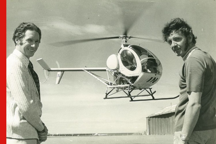Peter Button and Mark Dunajtschik pictured on 16 December, 1975, with one of the first helicopters used for emergencies.