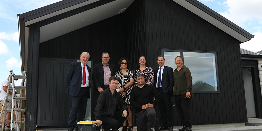 Waikato-Tainui Iwi stands with Westpac representatives outside one of the homes.