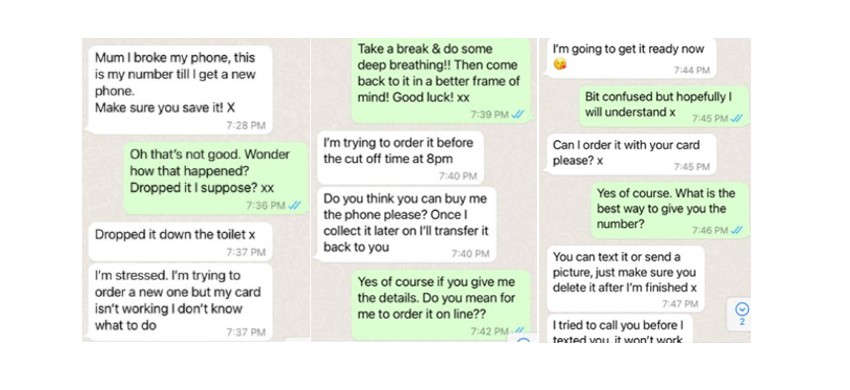 The scammer tells the parent they’re messaging from a new phone number and asks for help to buy a new phone, going on to request payment details.